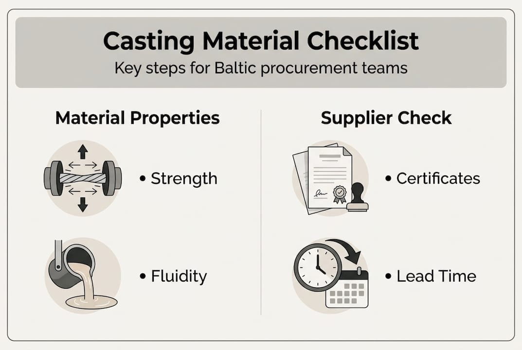 Selecting the right casting material is one of the most challenging decisions procurement professionals face. You need to balance mechanical properties, cost constraints, and supplier reliability while ensuring your materials arrive on time and meet exact specifications. This guide walks you through the complete selection process, from understanding material requirements to verifying quality upon delivery. You will learn how to evaluate casting materials, analyze costs in the Baltic industrial surplus market, and avoid common procurement pitfalls that can derail your projects.